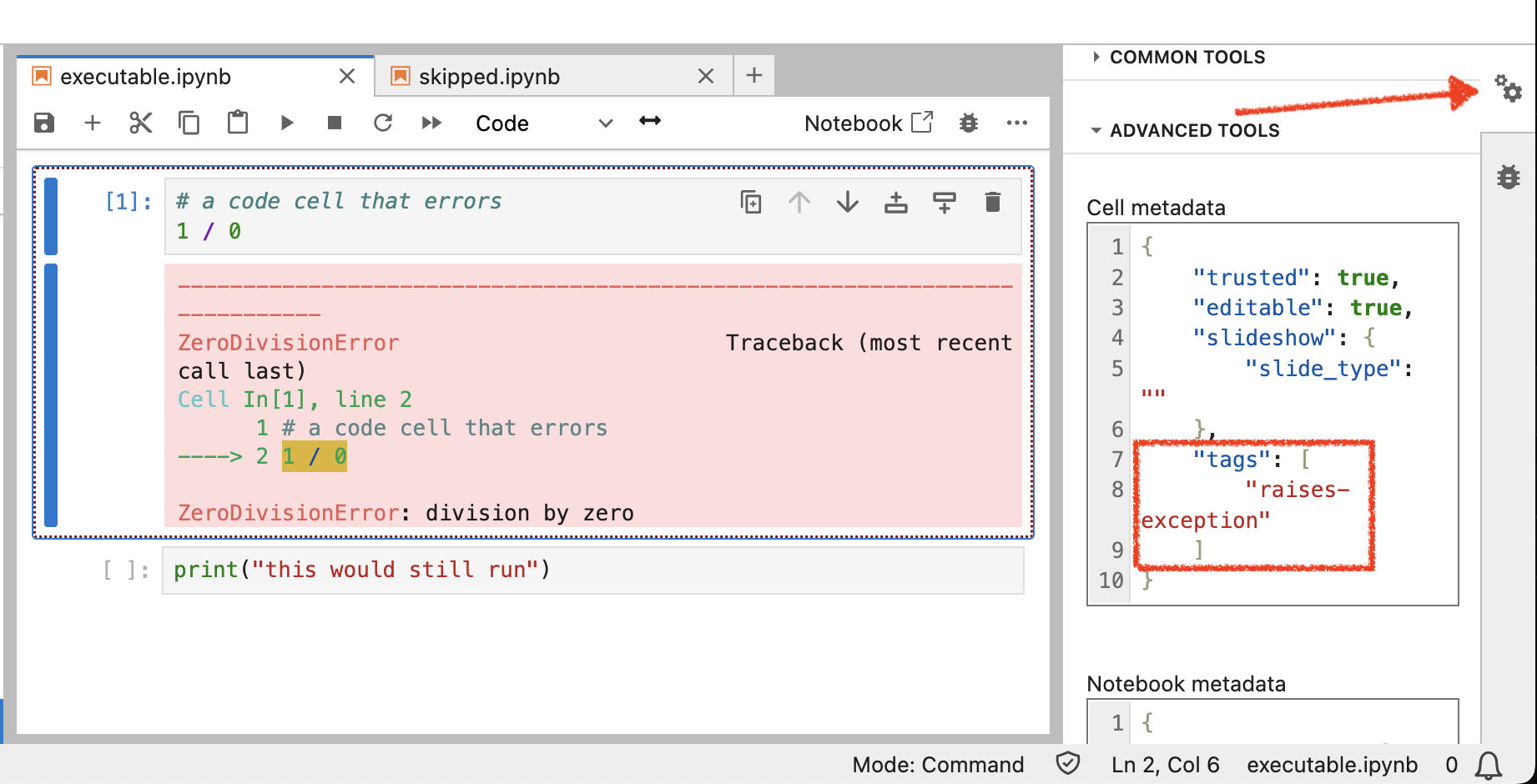 In addition, MyST also supports the {code-cell} directive for markdown notebooks; here is an example of adding the raises-exception tag on such a code cell:
